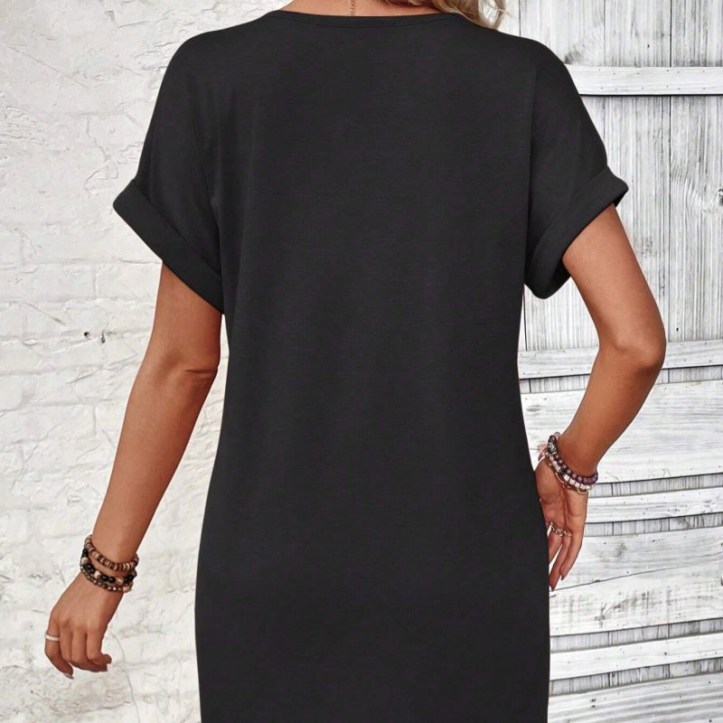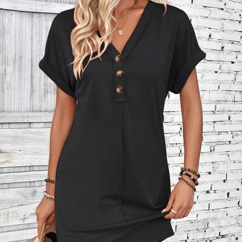 1 x modisches Damenkleid in Volltonfarbe mit Knöpfen, V-Ausschnitt und Rollärmeln