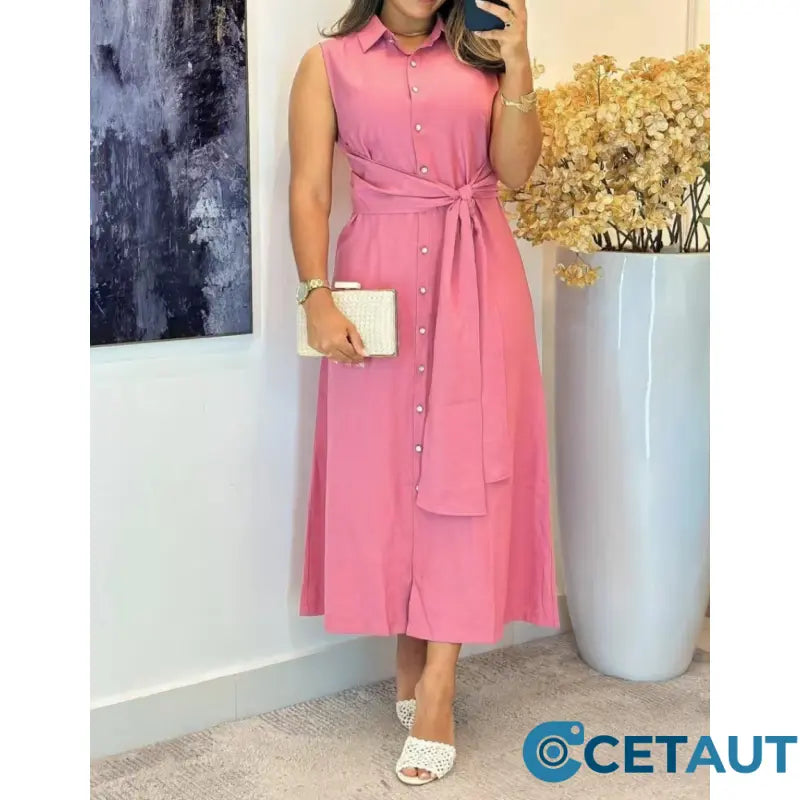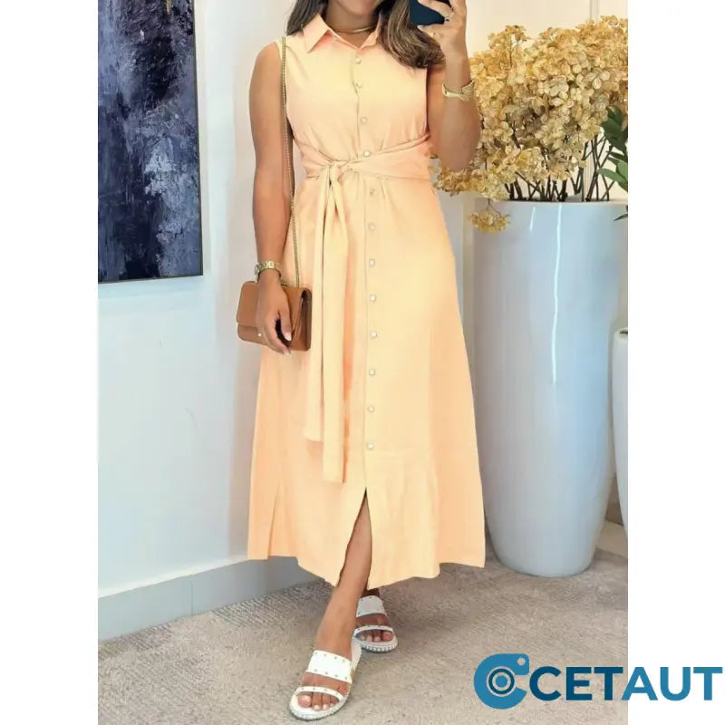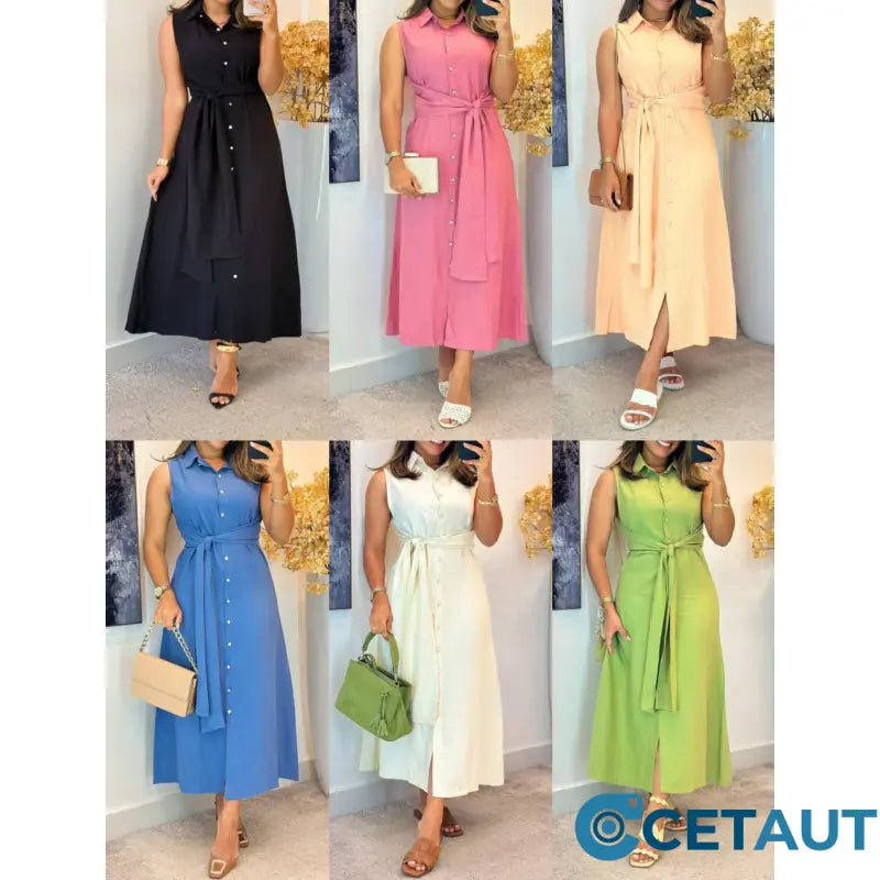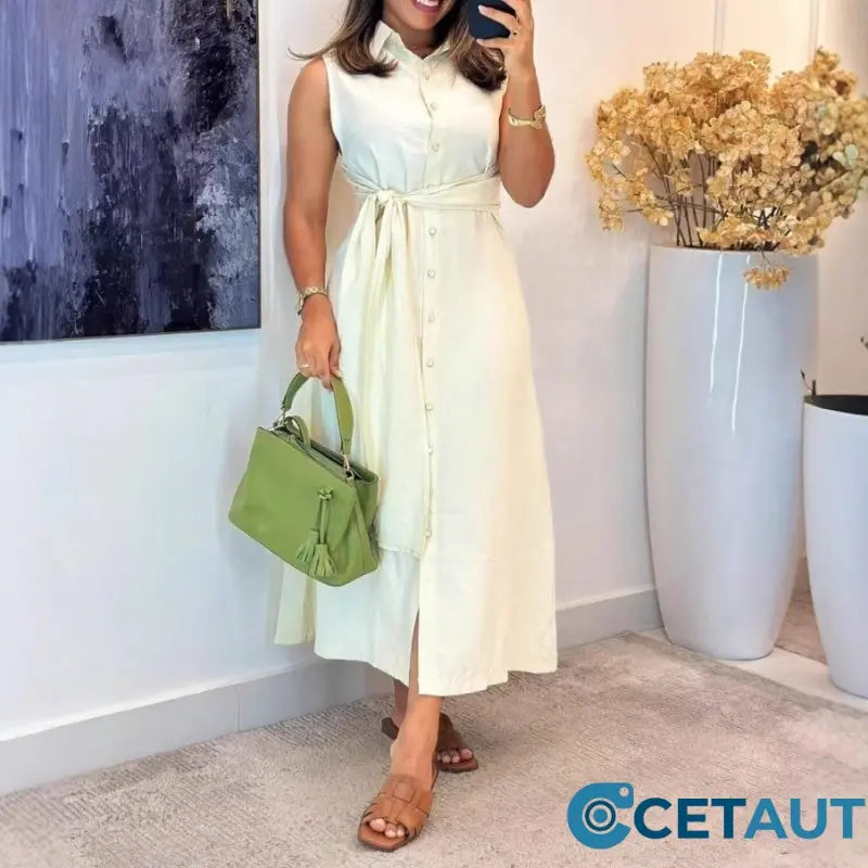ZEITLOSES BLUSENKLEID MIT KLASSISCHEM SCHNITT – Dieses ärmellose Blusenkleid verbindet zeitlose Eleganz mit moderner Lässigkeit. Der klassische Kragen und die durchgehende Knopfleiste sorgen für einen gepflegten Look, während die taillierte Passform Ihre Figur vorteilhaft betont. Der fließende Rock sorgt für Bewegung und macht das Kleid perfekt für lässige und formelle Anlässe.