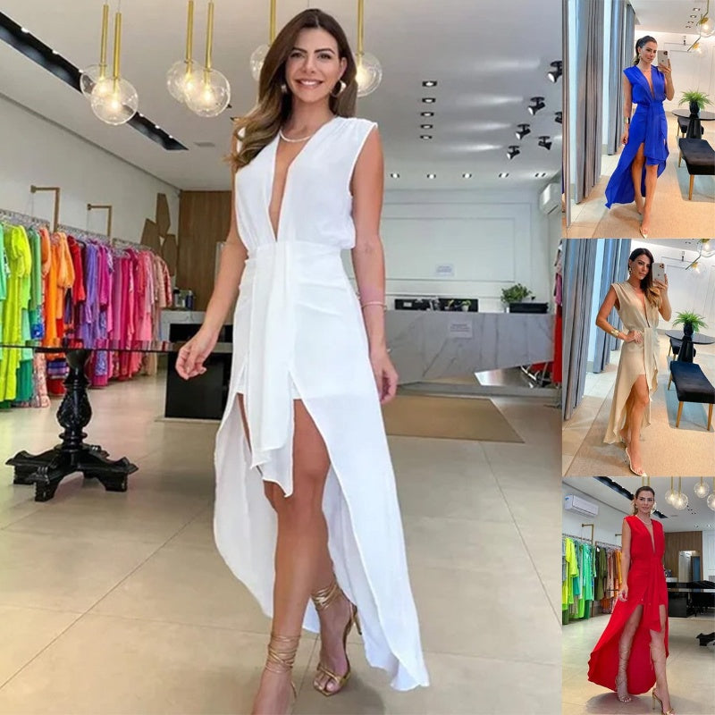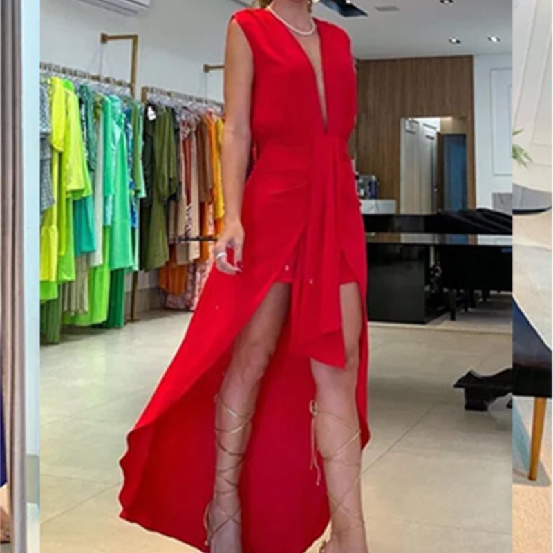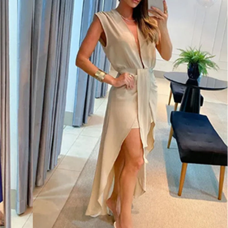 Ärmelloses High-Low-Kleid mit tiefem V-Ausschnitt