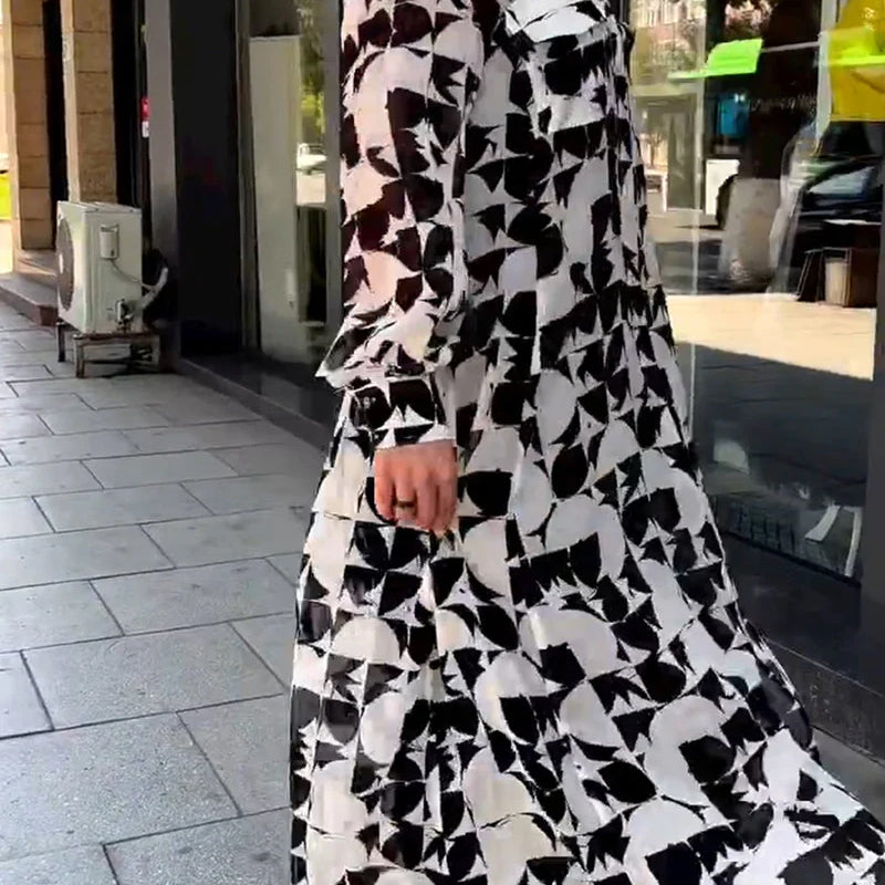 ELEGANTES ABSTRAKTES DESIGN: Dieses Kleid besticht durch ein einzigartiges schwarz-weißes abstraktes Muster, das zeitlose Eleganz ausstrahlt. Ein vielseitiges Kleidungsstück, ideal für legere Ausflüge, formelle Anlässe oder Abendveranstaltungen.