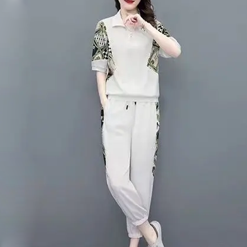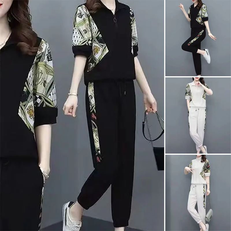 Damen Floral Patchwork Sport Kurzarm Top & Casual Hose Set