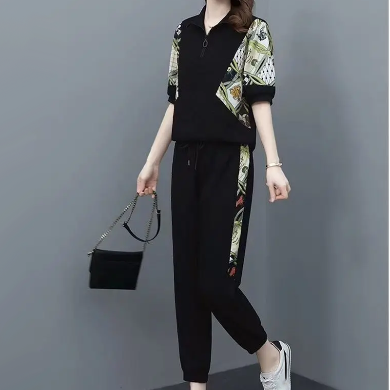 STYLISCHES FLORALES PATCHWORK-DESIGN: Das Set zeichnet sich durch ein trendiges florales und geometrisches Patchwork-Muster auf den Ärmeln und der Hose aus, das leuchtende Farben mit einer modernen Ästhetik kombiniert. Dieses auffällige Design unterstreicht Ihre modische Aussage und eignet sich perfekt für Freizeitausflüge, Workouts oder entspannte gesellschaftliche Zusammenkünfte.