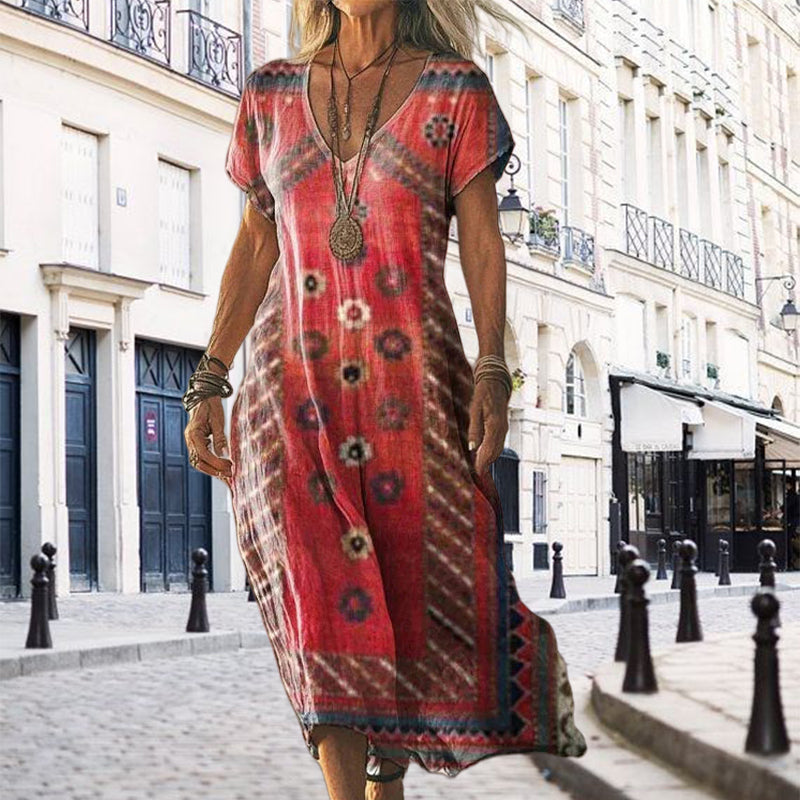 Bedrucktes, kurzärmliges, langes Kleid mit V-Ausschnitt für Damen