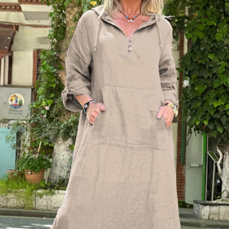 Langes Damenkleid mit langen Ärmeln, Schlitz und Kapuze