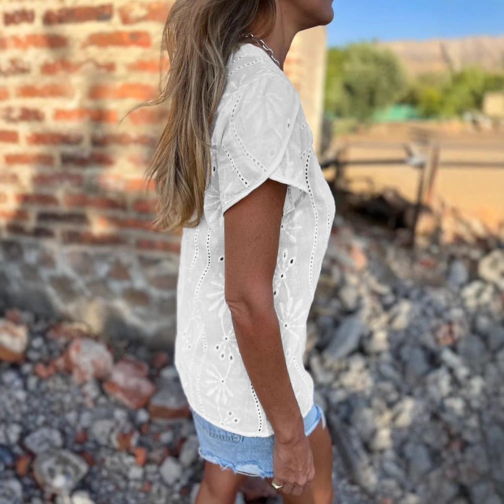 1 * Frauen V-Ausschnitt Stickerei Hollow Kurzarm-Shirt